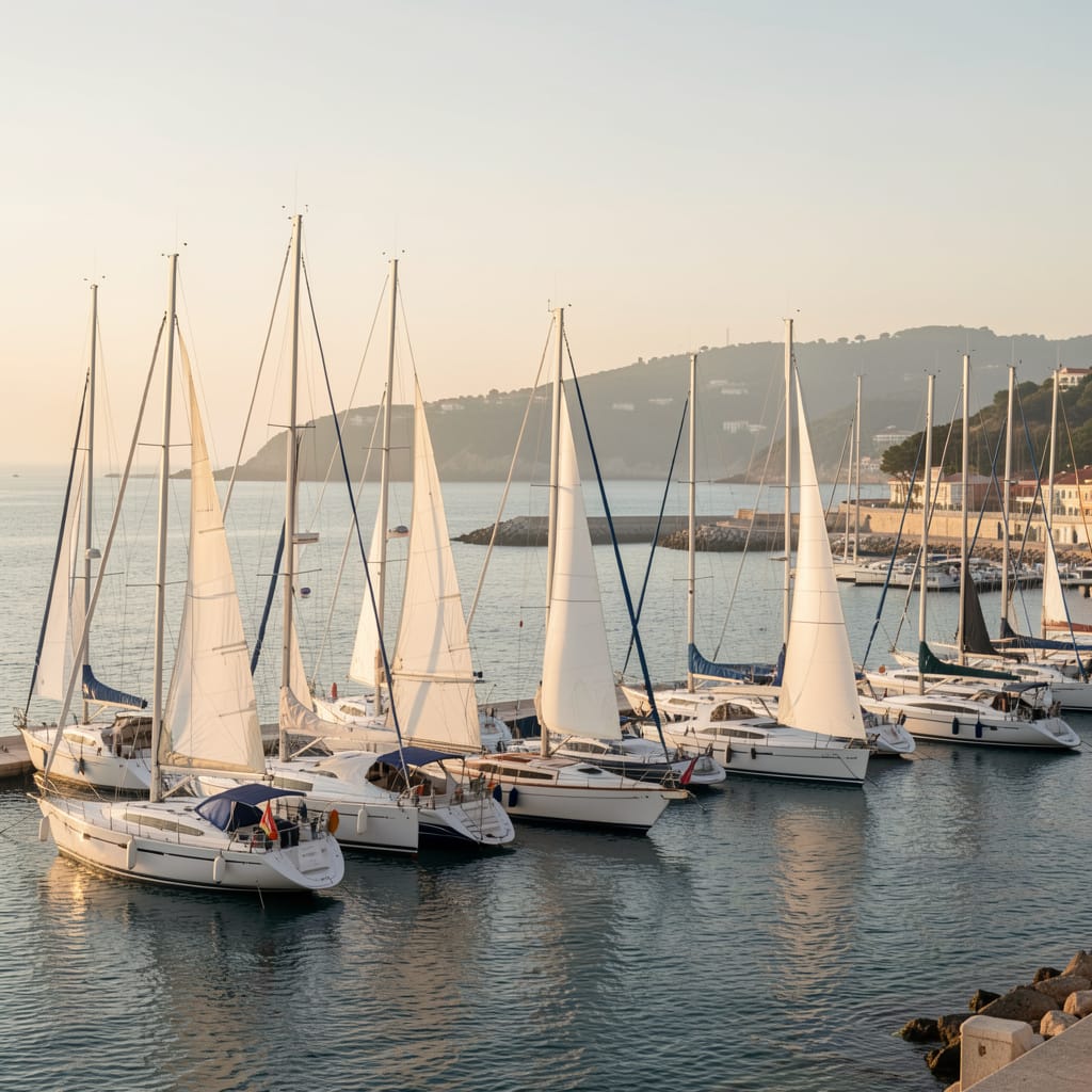 This photo is an AI generated photo of a marina of sail boats off the coast of Cascais, Portugal.
